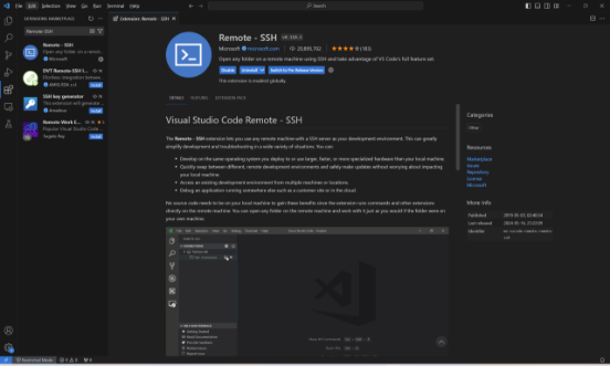 在vscode左侧工具栏,选择Extensions(ctrl+shift+x)后,在搜索框输入Remote-SSH,选择右下角的Install进行安装
