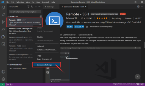 左侧栏打开Extentions,找到已经安装好的Remote -SSH,右键点击,选择“Extension Settings”