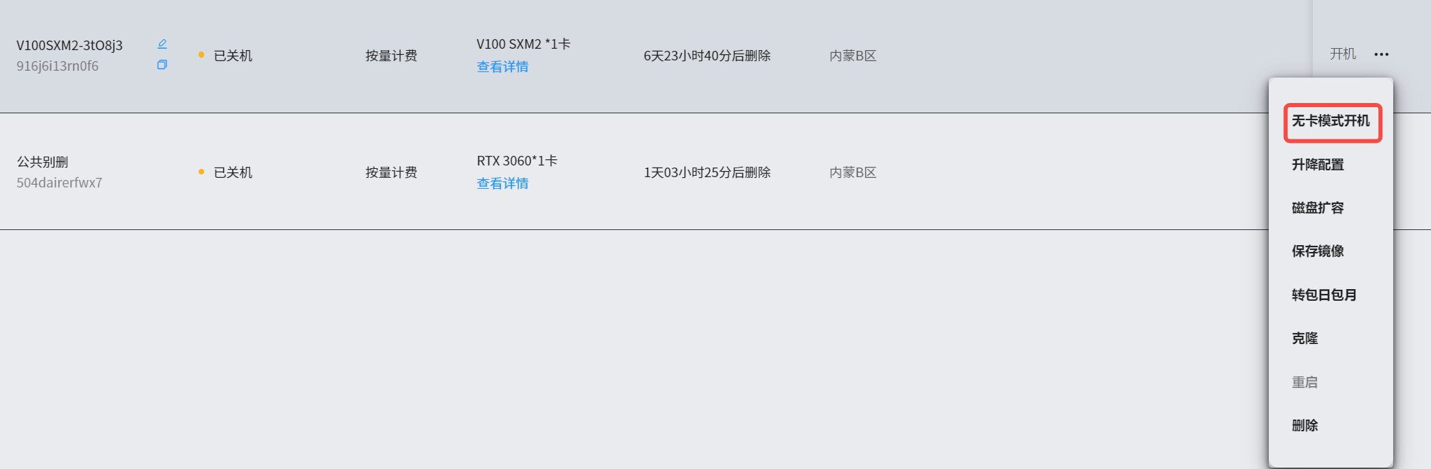 (1)点击开机,开启当前所需实例(建议使用无卡模式开机)