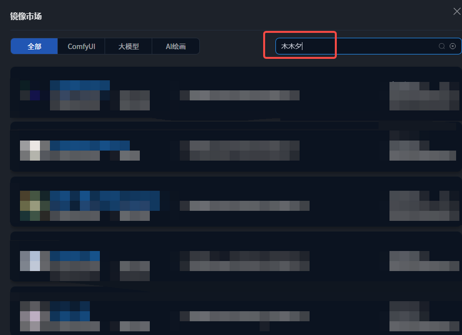 在右上角输入“木木夕”,找到《木木夕AI绘画工具包》的镜像,点击“确定”。