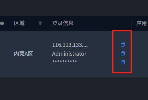 从上到下依次是"IP地址"、"用户名"、"密码",右侧小方块可以点击复制。