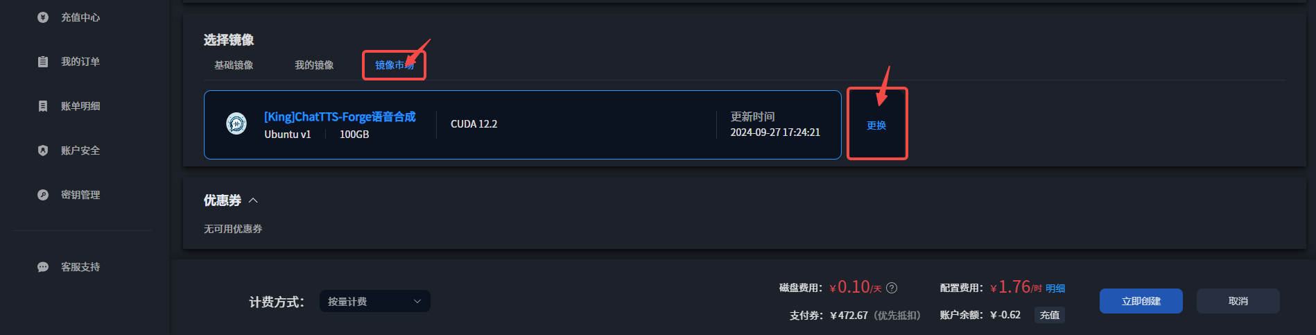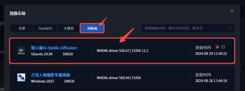 - 创建实例,镜像请依次点击:“镜像市场”->“更换”->“AI绘画”->“萤火遛AI-Stable Diffusion”。