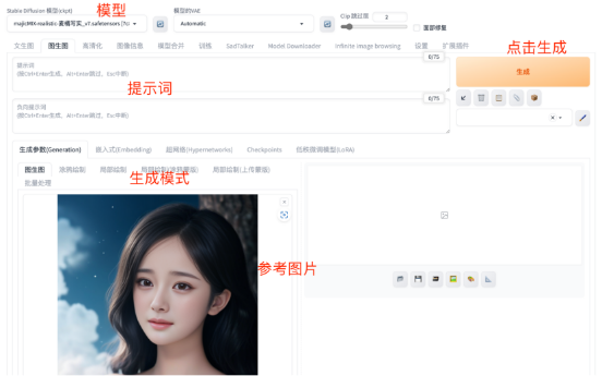 文生图可使用文本提示词引导图片的生成。只需要选择生成图片所需要的Stable Diffusion基础模型,填写必要的文本提示词,选择图片参数(宽度、高度等),最后点击“生成”,即可生成文本提示词相关的图片。