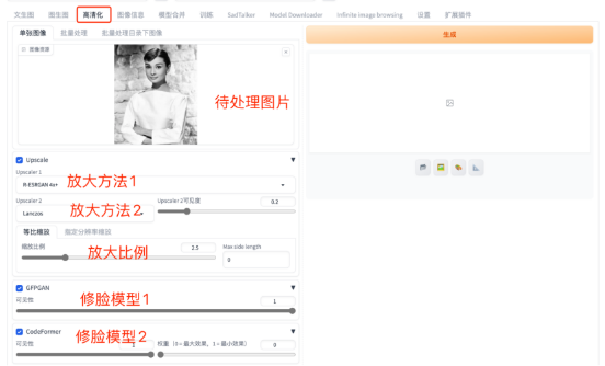 高清化放大图片,让图片更加清晰。这个功能不需要Stable Diffusion基础模型的参与,只需要上传一张待高清化处理的图片,选择合适的放大方法、放大比例,为了让人物的形象更加和谐,可以选择两种修脸模型:GFPGAN可以尽量保持人物的面部特征,CodeFormer可以让人脸更协调,但是会偏离原始人物的特征。