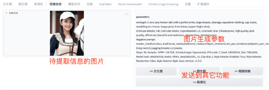 只需要上传一张Stable Diffusion生成的图片,就可以自动显示生成图片的参数,包括提示词、使用的模型等等,然后我们可以复制这些参数,用于自己的图片生成,也可以直接把这些参数发送到“文生图”、“图生图”、“高清化”等相关功能。