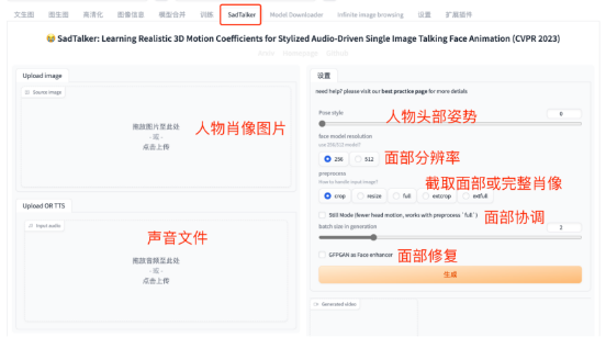 SadTalk 不依赖Stable Diffusion基础模型,只需要上传一张人物肖像图片和声音文件,即可生成一个指定人物说话的视频。这个提供了一些参数,可以让视频中人物的形象更和谐稳定。