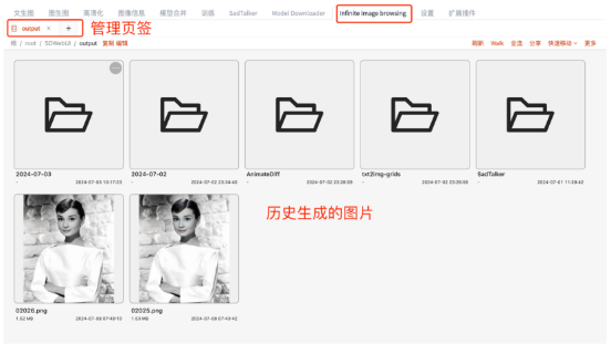 生成图片浏览。通过这个功能,我们可以浏览历史生成的图片,方便管理它们。