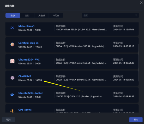 星海AI-GPU平台内提供的GPU均满足ChatGLM3-6B运行需求,可任意选择GPU创建实例