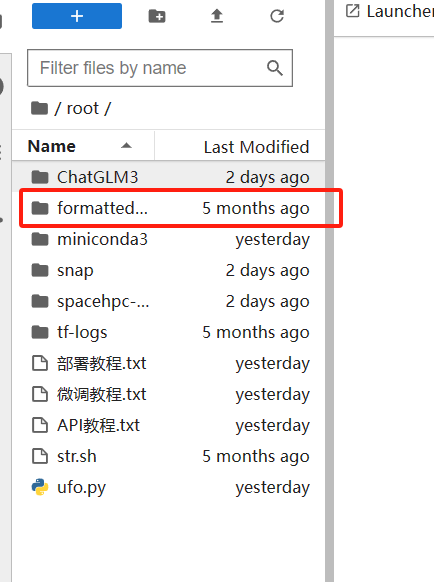 在左边的操作界面,去到ChatGLM3/finetune_chatmodel_demo路径下。在这里,你会找到一个名为formatted_data的文件夹,用于存放数据集。