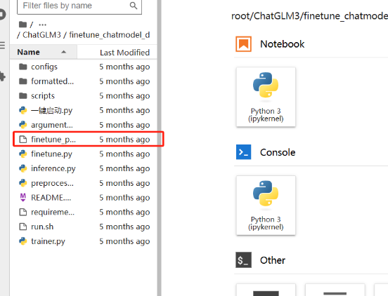 bash /root/ChatGLM3/finetune_chatmodel_demo/finetune_pt.sh当训练进度条全部完成后,回到ChatGLM3/finetune_chatmodel_demo路径下,打开"一键启动.py"文件。