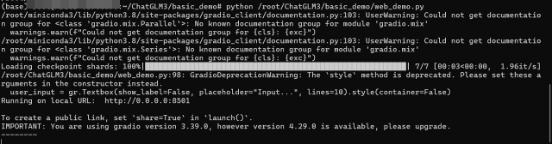 执行python /root/ChatGLM3/basic_demo/web_demo.py,成功运行服务后终端出现如下界面,出现