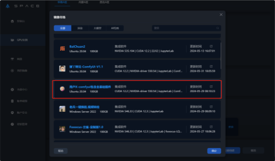 2.选择镜像市场,点击更换镜像,选择【用户X-comfyui包含全基础插件】,最后点击立刻创建即可