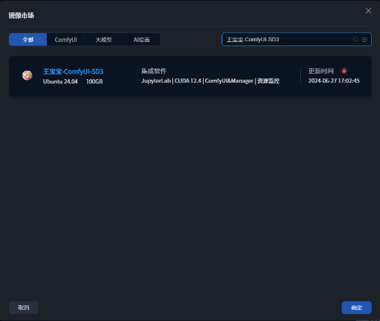 选择镜像市场,点击更换镜像,输入 王宝宝-ComfyUI-SD3 回车
