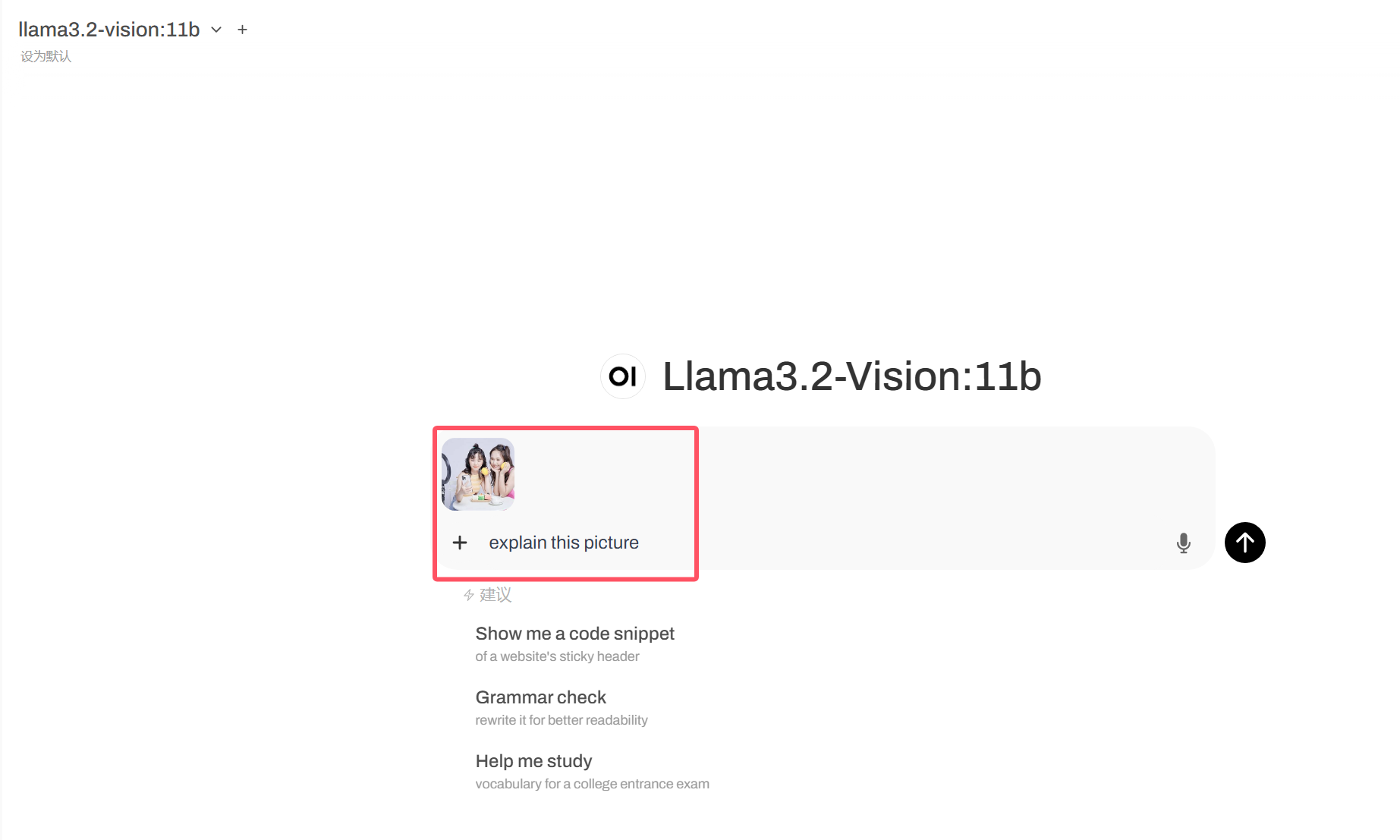 选择好模型后,在输入框添加图片,使用英文进行对话。