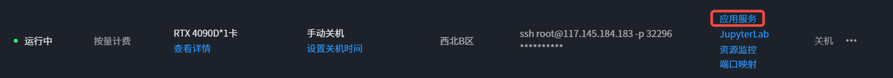 实例创建完成后,滑动下方滚动条,在实例右侧有应用服务按钮,点击打开界面。