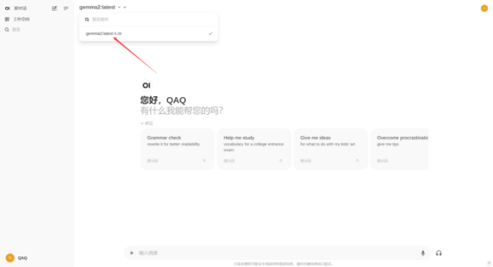 模型下载完毕后可进行对话,以gemma2为例,下载后可以在界面内选择已经下载的模型