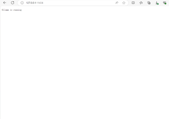 为了验证ollama是否启动成功,我们可以在浏览器中输出:http://127.0.0.1:11434/ ,显示:Ollama is running,如下界面即启动成功。