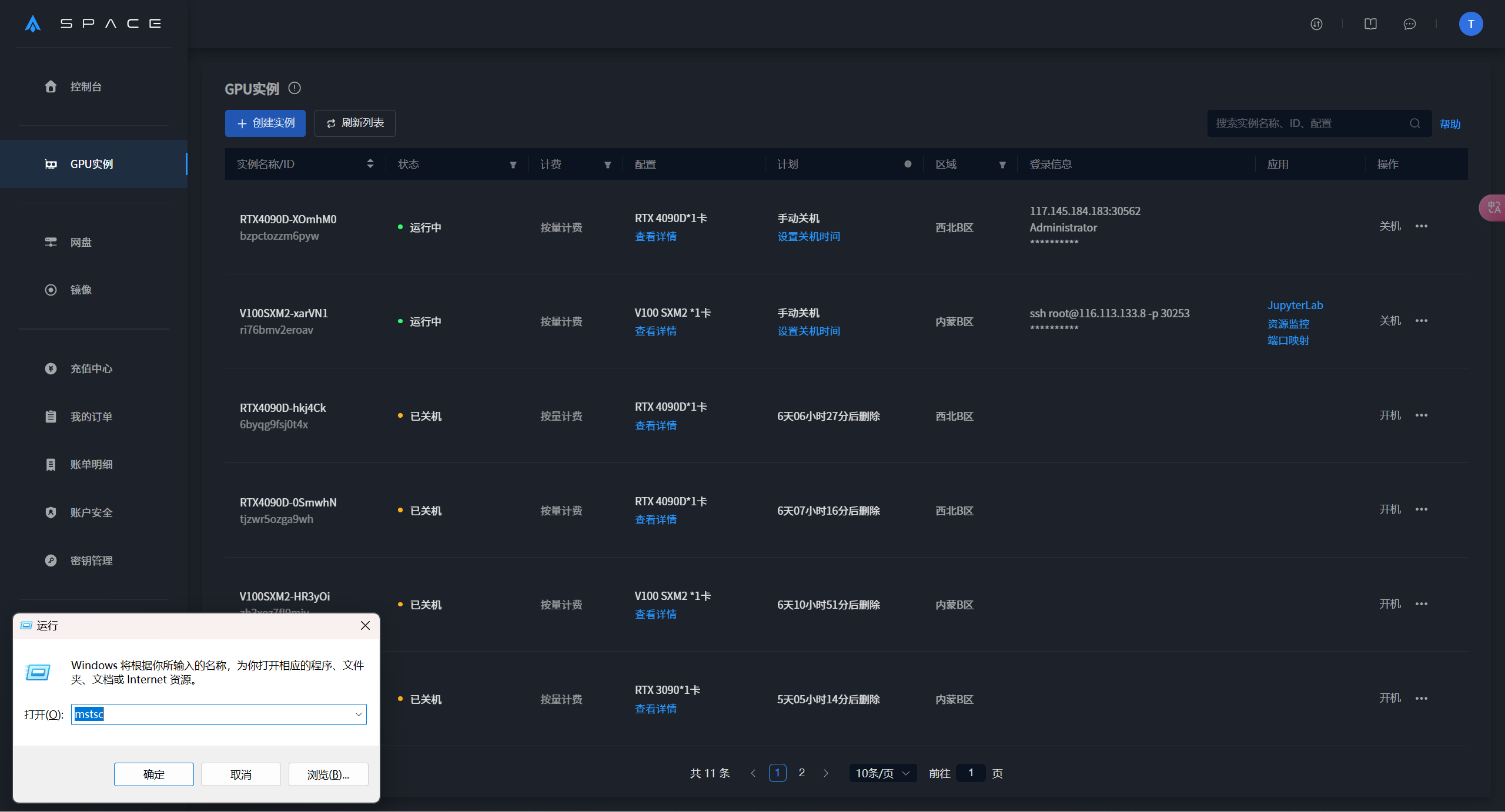 创建实例后进行远程桌面连接,按下Win+R键,在弹出的窗口输入mstsc。