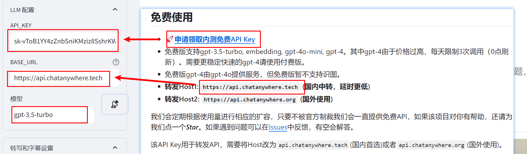 输入自己的API密钥和相关链接地址以及所需的大语言模型,这边以gpt-3.5-turbo为例。