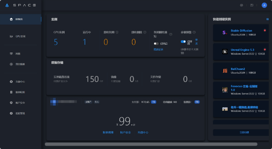 注:星海智算最近更新了控制台,可在主页面查看个人账户的实例运行状态和余额状态,也可直接在右边选择想使用的镜像