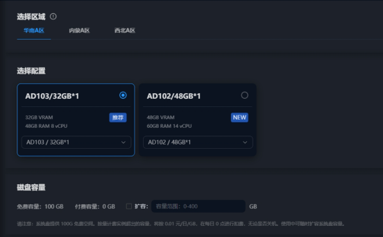 2、选择区域并选择合适的显卡,建议使用4090