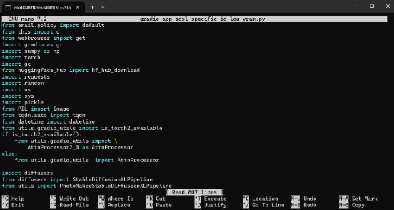 使用nano gradio_app_sdxl_specific_id_low_vram.py命令打开文件进行编辑