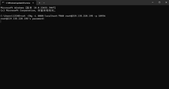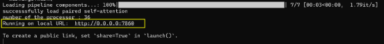 如图所示,7860端口成功与本地8888端口建立连接,说明运行成功,本地可通过8888端口进行访问