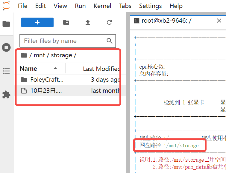 Linux系统实例打开jupyterlab,可以在mnt/storage路径下看见自己的网盘文件。