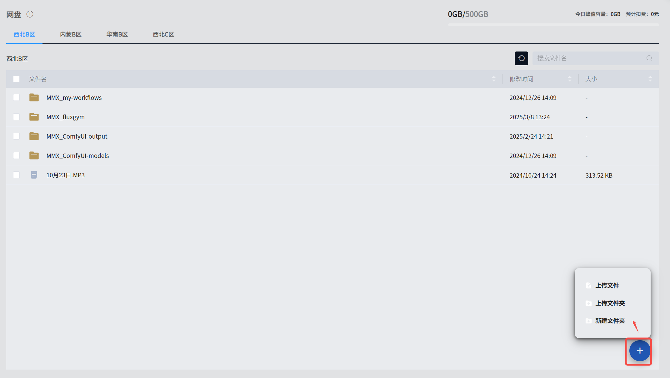 点击网盘界面右下角蓝色+,会显示上传相关操作。