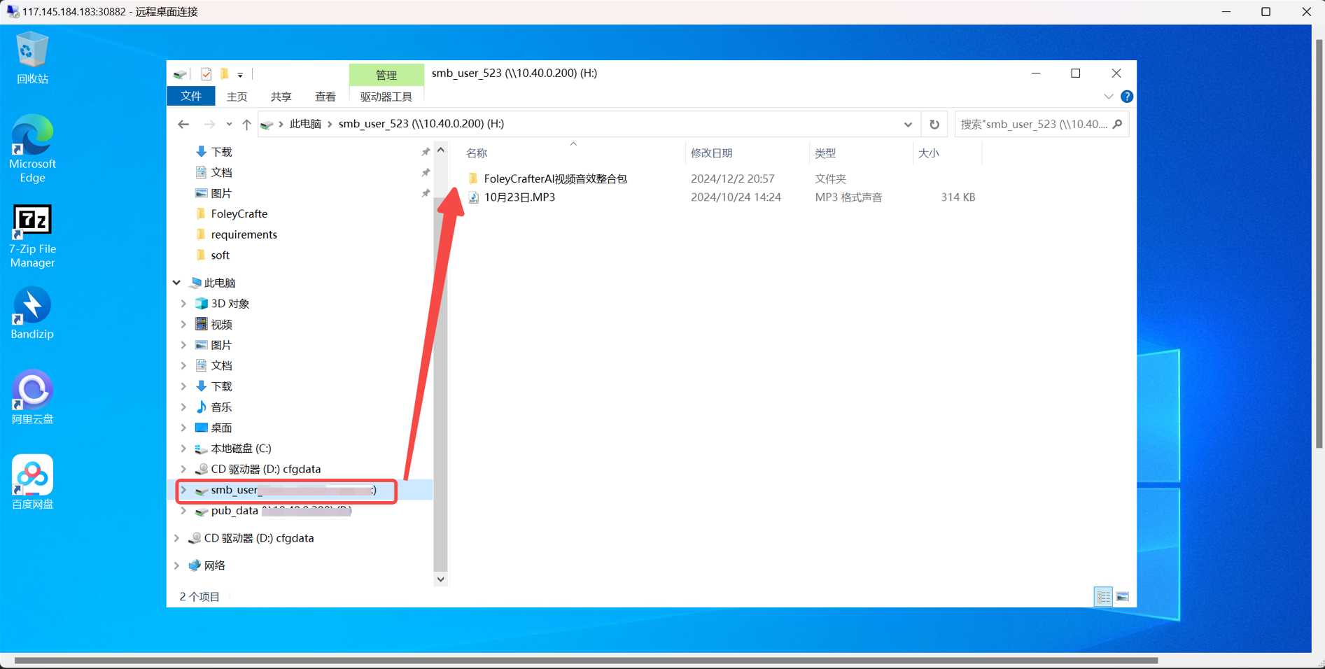 Windows系统实例远程连接后,可以在文件资源管理器目录下看见网盘文件。