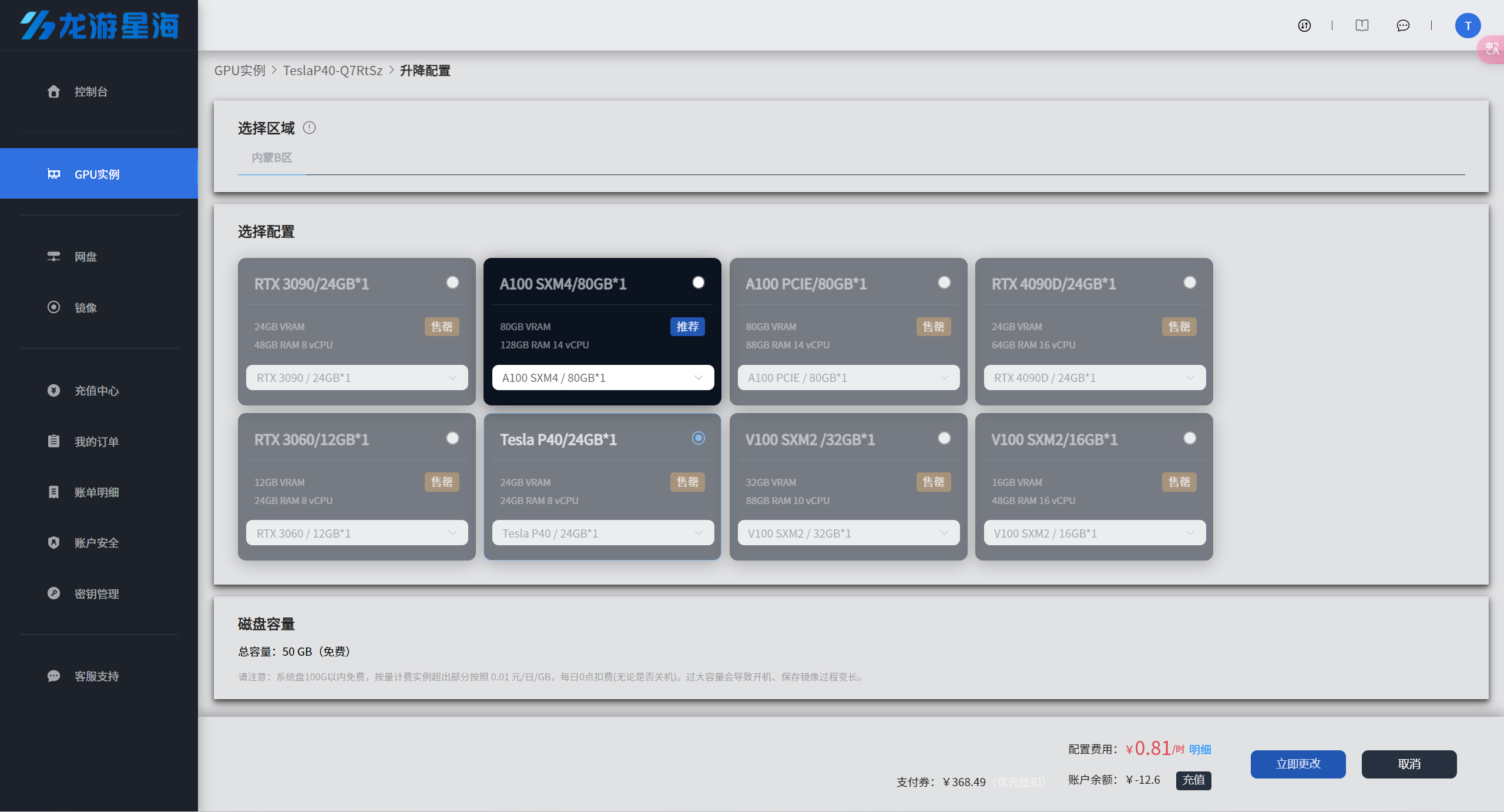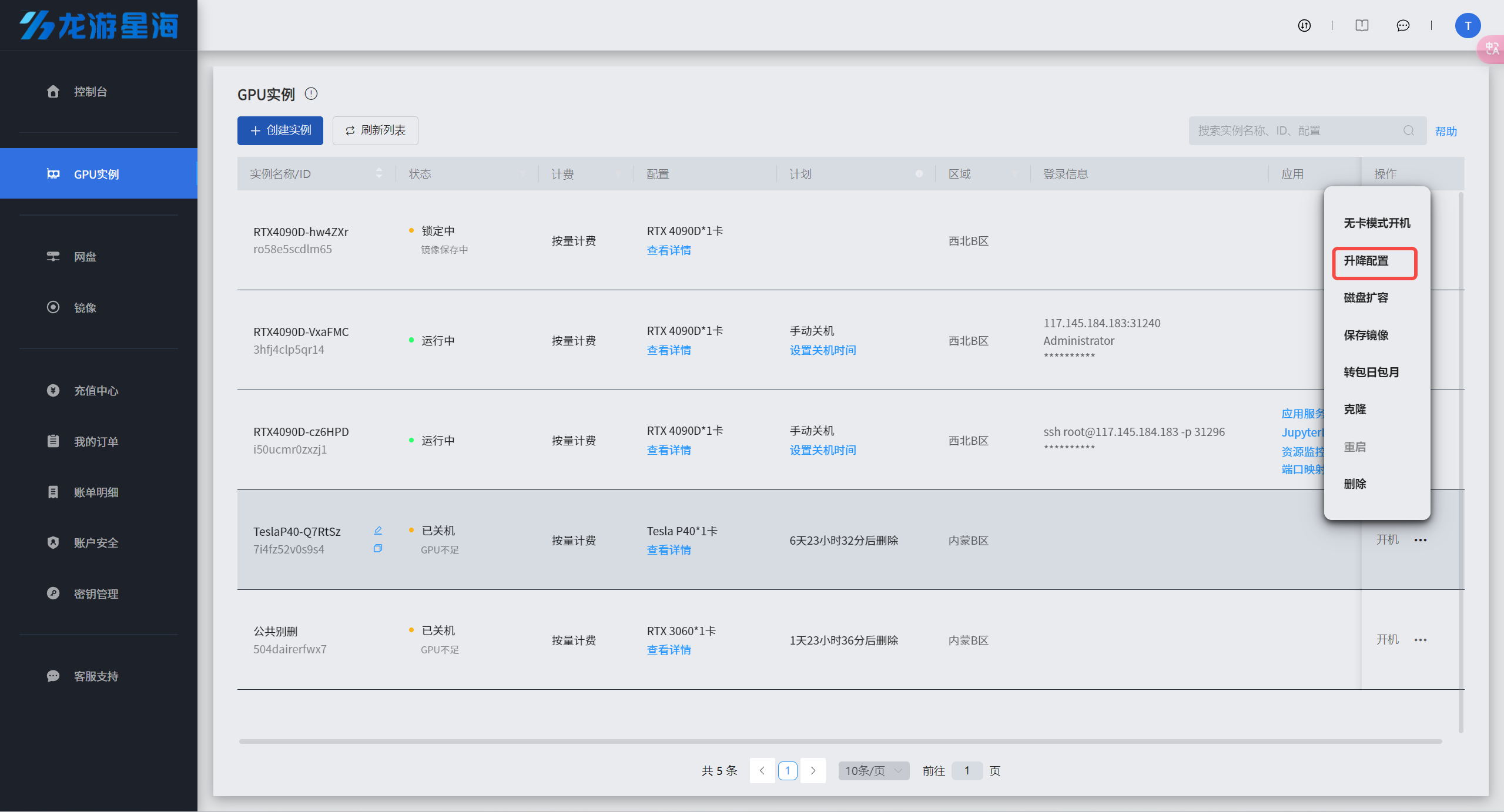 ⚠️对于已开机的按量计费的实例,如果需要增加或减少GPU的数量,可以通过升降配置功能来调整实例配置。对于包日包月的实例,如果想要升降配置,则需要先转按量计费后升降配置。(
